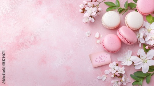 Elegant pink macaroons with cherry blossoms on a pastel background