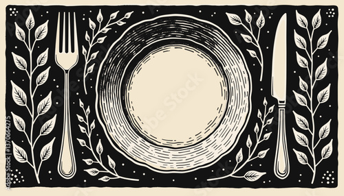 plate, fork, knife, foliage, elegant, vintage, dining, food, black, white, table, decoration, meal, rustic, design, eatery, cookery, empty, style, nature, utensil, epicure, lunch, dinner, tableware, festive, organic, handcraft, simple, background, culinary, artwork, dining table, seasonal, home, hospitality, feast, aesthetic, beautiful, artistic, interior, celebration, event, classic, setting