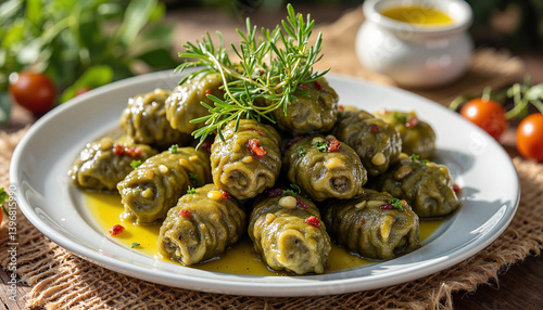 Elegant platter of dolmades with fresh herbs, Mediterranean dining