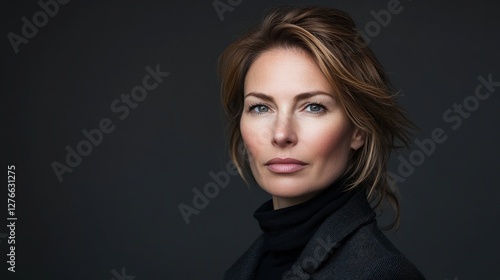 portrait, woman, beauty, confidence, elegance, fashion, model, head shot, natural, coiffure, make-up, studio, dark background, professional, stylish, chic, sophisticated, glamour, closeup, facial features, artistic, serene, calm, personality, modern, trendy, expressive, alluring, captivating, female, adult, young, lifestyle, self-assured, caucasian, minimalistic, background, copy, space, 30s, white, american, european