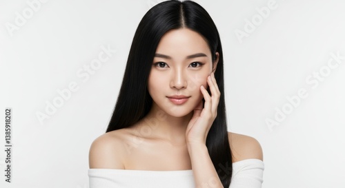 Elegant portrait of a woman with long black hair in a white off-shoulder top on a clean background