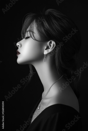 profile, portrait, woman, jewellery, greyscale, elegant, sideview, necklace, earring, monochrome, fashion, beauty, style, female, sophisticated, artistic, pose, coiffure, glamour, chic, minimalist, delicate, face, expression, adornment, lady, elegance, refinement, classic, timeless, poise, grace, silhouette, attire, accessory, allure, charme, black-and-white, exquisite, serene, tasteful, calmness, femininity, portraiture, artistry, polished