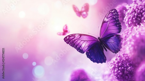 Elegant Purple Butterfly Flying Among Flowers on Dreamy Bokeh Background