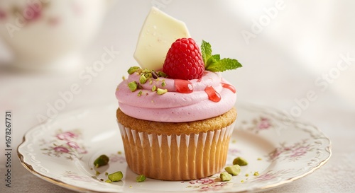 Elegant Raspberry Rose Cupcake with White Chocolate and Pistachios on Decorative Plate