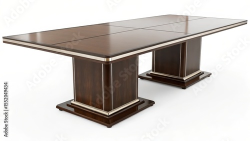 Elegant rectangular dining table featuring a dark wood finish, dual pedestal base, and metallic trim accents, ideal for upscale interiors.