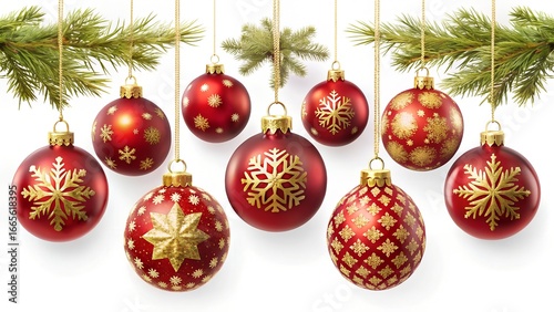Elegant Red and Gold Christmas Ornaments Hanging from Evergreen Branches on White
