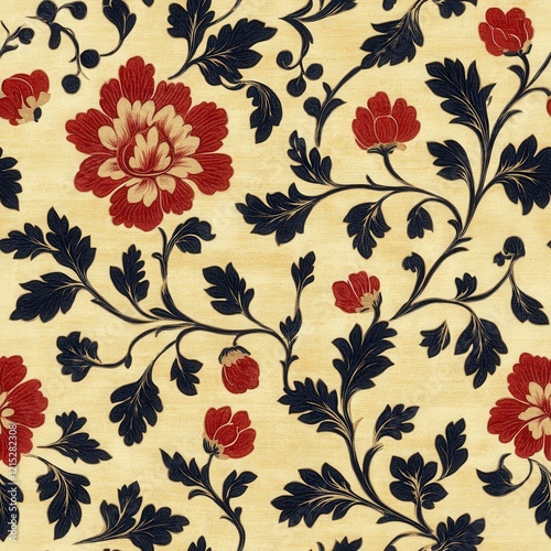 floral, damask, pattern, seamless, textile, fabric, wallpaper, background, beige, cream, red, navy blue, dark blue, flower, foliage, leaf, vine, elegant, opulent, vintage, antique, classic, traditional, design, repeat