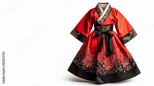 dress, traditional, red, fabric, embroidery, floral, garment, silk, fashion, culture, style, attire, outfit, design, beauty, craftsmanship, elegance, decoration, heritage, textile, pattern, lavish, vibrant, luxurious, detail, seam, neckline, sleeve, bow, asian, feminine, hand-made, model, showcase, presentation, clothes rack, special occasion, celebration, event, stunning, vibrant color, unique, bold, festive, ornamental, chic