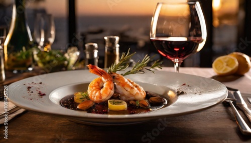 Elegant Restaurant Dinner Scene With a Gourmet Seafood Dish, Served With Fresh Herbs, Spices, and Wine Pairings for a Luxurious Fine Dining Experience