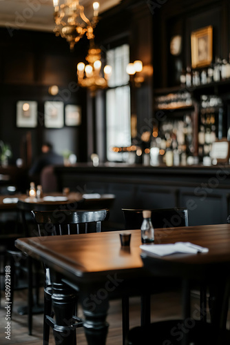 eatery, interior, dining, table, chair, chandelier, lighting, vintage, ambience, cosy, warm, elegant, soft focus, bar, counter, bottle, goggles, dinner, luxury, style, atmosphere, relaxation, inviting, dark, shadow, blurred, background, decor, design, establishment, indoor, setting, classic, traditional, formal, candle, napkin, drink, artwork, wall, window, pattern, grain