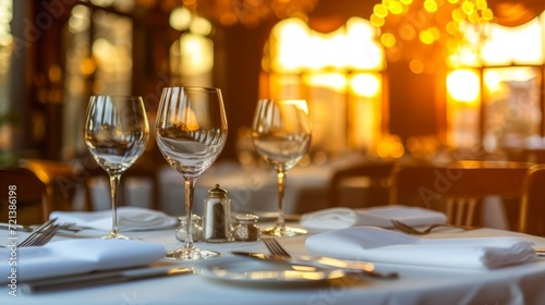 Elegant restaurant interior with wine glasses on a table