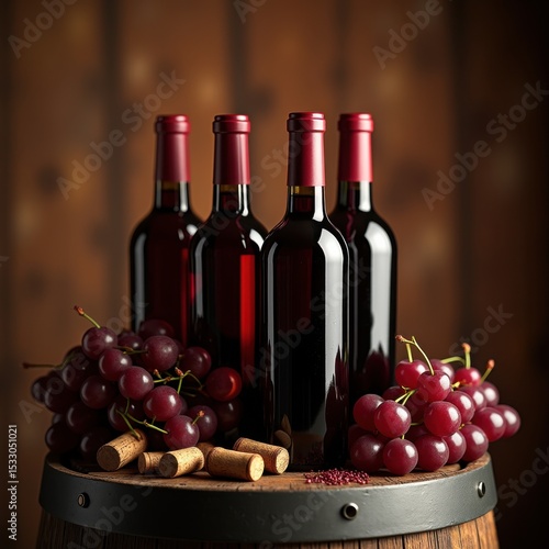 elegant rich red wine bottles arranged rustic wooden barrel dramatic lighting textured background, elegance, liquid, glass, alcohol, container, brew