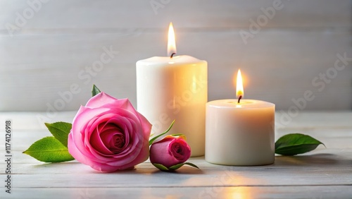 Elegant rose candle photography on white. Luxury home décor, romantic still life.