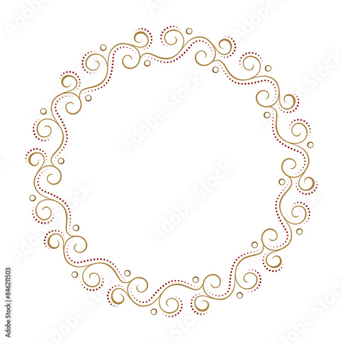 Elegant round frame featuring intricate gold and red swirls, ideal for invitations, announcements, or decorative designs.