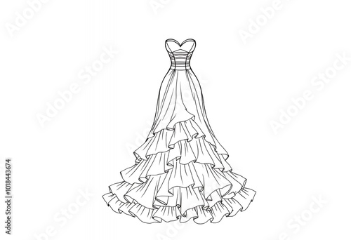 Elegant Ruffled Wedding Dress Line Drawing Illustration