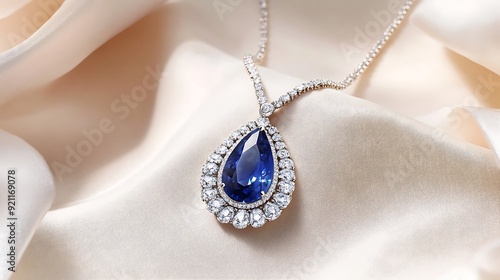 Elegant Sapphire Teardrop Necklace on Beige Canvas, Shopping Highlight Concept.