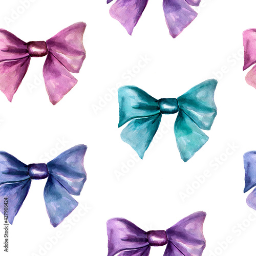 Elegant satin bows in blue and pink watercolor seamless pattern. Template for decorating designs and illustrations.