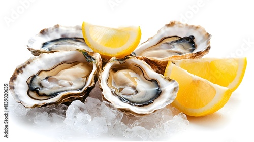 elegant seafood dish, four oysters with lemon wedges on ice, close-up freshness, clean aesthetic, isolated on white background