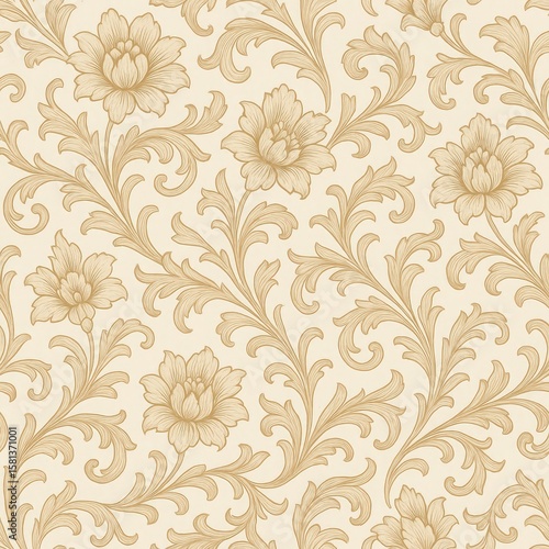 Elegant seamless floral pattern with intricate golden brown stylized flowers and swirling acanthus leaves on a cream background evoking classic damask wallpaper
