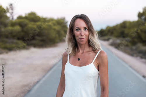 elegant, self-assured, modern, woman, wearing, fashionable, springtime, clothes, fashion, lifestyle, white, dress, beauty, hair, model, street, dusk, blond, adult, caucasian, 30s