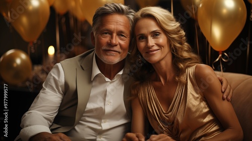 elegant senior couple with glass of champagne looking at camera happily while sitting on sofa against golden balloons