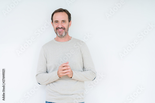 Elegant senior man over isolated background Hands together and fingers crossed smiling relaxed and cheerful. Success and optimistic