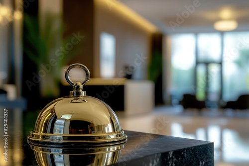 Elegant Service Bell on Reception Desk with Luxurious Hotel Background – A Travel Concept for Holiday and Resort Getaways