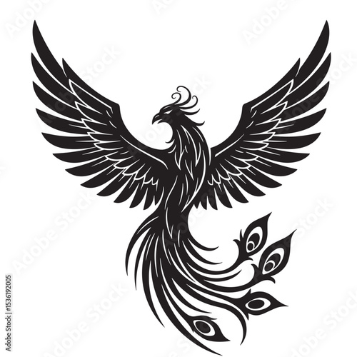 Elegant silhouette of a majestic phoenix bird displaying its wings in graceful flight against a clean white background