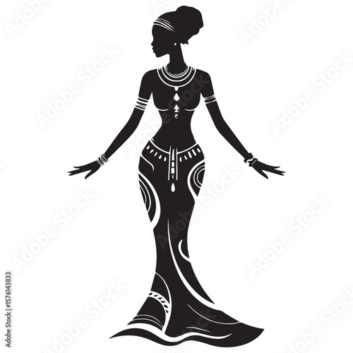 african, woman, silhouette, traditional, attire, dress, jewellery, necklace, earring, bracelet, headband, tribal, ethnic, culture, elegance, graceful, beauty, fashion, style, art, illustration, graphic, design, black, and, white, isolated, background, female, model, dancer, ceremonial, ornate, pattern, decorative, feminine, heritage, icon, symbol, outline, vector, artistic, elegant, regal, striking