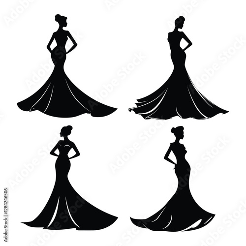 silhouette, woman, dress, formal dress, evening dress, bridal gown, gown, fashion, design, model, female, elegant, sophisticated, timeless, vector, graphic, illustration, black-and-white, black, white background, wedding, party, event, invitation, luxury, glamourous, bride, prom, formal, contour, line art, graphic design, print, digital, template, haute couture