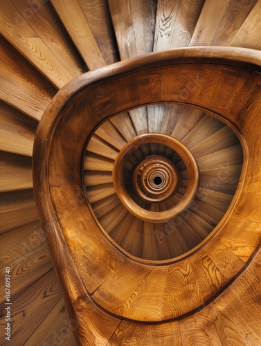 Elegant spiral wooden staircase. Luxury varnished wood at home. Unique wooden staircase in a modern interior