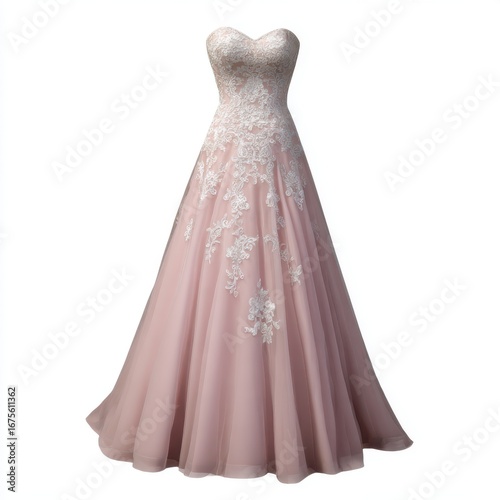 Elegant strapless blush pink ball gown with intricate lace applique and flowing skirt isolated on white background