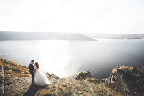 Elegant stylish happy wedding couple, bride, gorgeous groom on the background of sea and sky