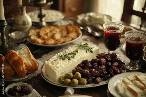 elegant, table, setting, cheese, dried fruit, bread, tableware, home, meal, dining, atmosphere, inviting, decoration, hospitality, epicure, culinary, nourishment, sweet, savoury, tradition, gathering, feast, celebration, natural, rustic, delicious, presentation, drink, glasses, beverage, dessert, widener, herbal, garnish, texture, clothes, light, warm, background, simplicity, comfort, favor, culture, scene