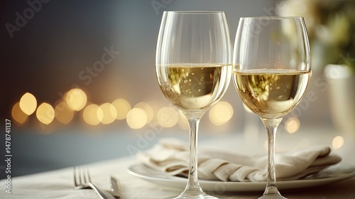 Elegant table setting with two wine glasses filled with white wine, soft overhead light creating a romantic and sophisticated atmosphere for a celebration or special occasion