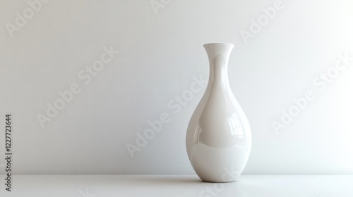 Elegant tall white ceramic vase with narrow neck and glossy finish on minimalistic white table against blank wall for stylish decor or text.
