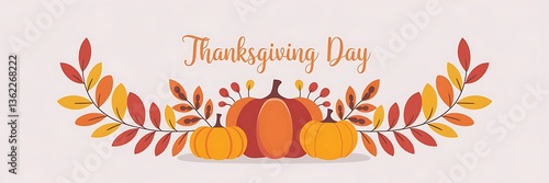 Elegant Thanksgiving Day composition with pumpkins, autumn leaves, golden accents and Thanksgiving Day in orange cursive on a clean white background. A festive and inviting design for the holiday