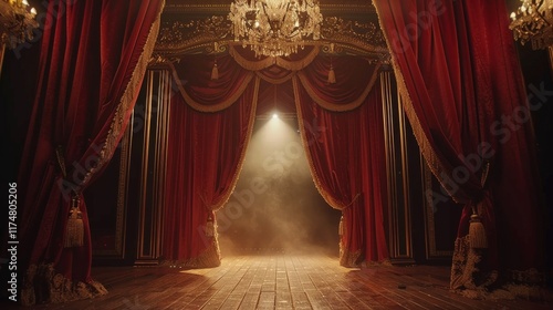Elegant Theater Stage with Red Curtains and Chandeliers