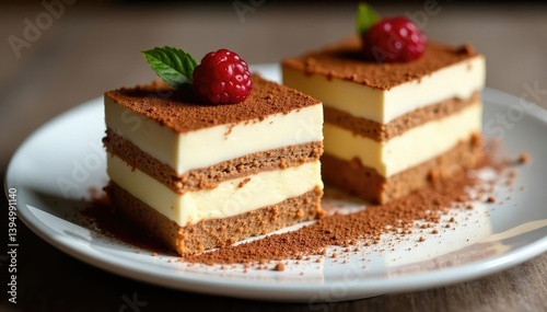 Elegant tiramisu slices; rich, velvety texture, dusted cocoa , restaurant, confection, gourmet