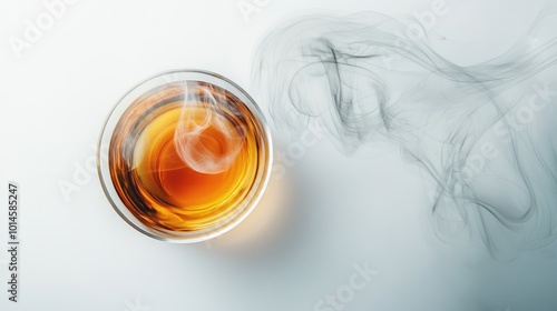 Elegant top view of a glass of hot tea with visible steam swirling into the air, placed on a white background, no people