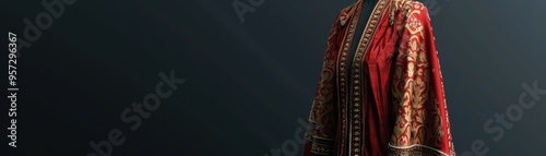 Elegant traditional dress with intricate embroidery, rich red and gold details, showcasing cultural heritage and artisanal craftsmanship.