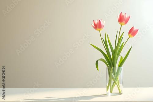 Elegant tulip blooms in glass vase casting gentle shadows, capturing nature's delicate beauty against a soft pastel surface, simple yet captivating still life