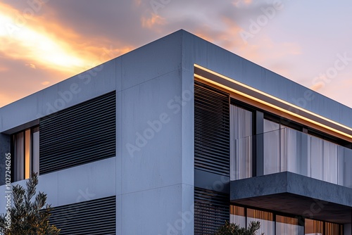 Elegant urban house with a contemporary design, white concrete walls, black wood slats, and gray metal accents under the sunset light