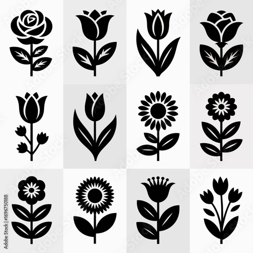 vector, illustration, scalable, icon, floral, flower, design, art, graphic, pattern, spring, summer, nature, botanical, decorative, element, black, white, silhouette, collection, set, grid, elegant, modern, stylised, simple, clean, minimalist, organic, growth, bloom, leaf, stem, rose, tulip, sunflower, clip art, vectorial, drawing, flat, symbol, creative, asset