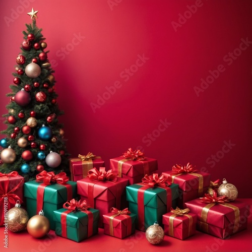 Elegant vertical Christmas scene featuring beautifully wrapped gifts and colorful ornaments on a vibrant red background creating a festive holiday atmosphere