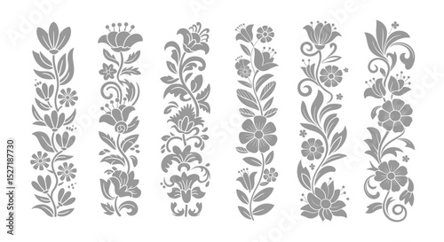 floral, flower, botanical, nature, vertical, design, element, vintage, elegant, flourish, border, divider, ornament, decoration, scroll, swirl, leaf, vine, stem, bud, blossom, plant, garden, spring, summer, wedding, invitation, card, certificate, menu, frame, graphic, vector, illustration, set, collection, bundle, grey, silhouette, stencil, pattern, texture, art, decorative, natural, organic