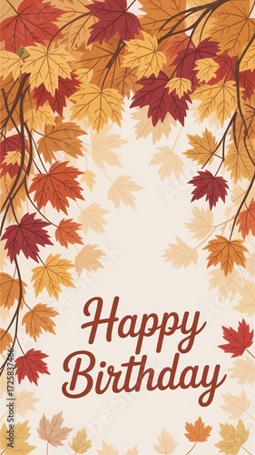 elegant, vertical, happy, birthday, autumn, maple, leaf, greeting, card, design, beautiful, watercolor, rich, red, yellow, seasonal, fall, celebration, harvest, thanksgiving, warm, colours, palette, nature, botanical, tree branch, foliage, script, calligraphy, graphic, stylish, digital, illustration, background, border, invitation, wallpaper, october, november, vintage, traditional