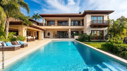 Elegant villa with infinity pool and lush tropical garden in front picture