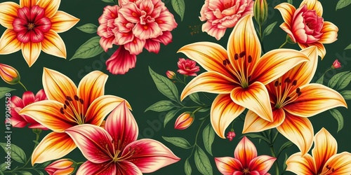 Elegant vintage floral textile design featuring lilies and vibrant blooms, bright flowers, vintage