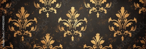 Elegant vintage wallpaper design with intricate gold patterns on a dark background.